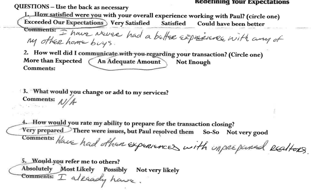 Most of the surveys I’ve sent out to newly closed clients were returned around 30 days after their closing. Clients kept my snail mail survey safe, with their other important documents, until they had a chance to breathe. It’s as if the survey was too important to just “get it off their plate” like today’s online reviews. Clients held on to it until they had the time to explain their true customer experience.